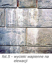 Innym spotykanym rodzajem zmian na powierzchni okładzin są wykwity i wycieki wapienne, powstające w miejscach wydostawania się wody i wilgoci na zewnątrz, przy zastosowanych niewłaściwych zaprawach i fugach (fot. 5). Skutecznym sposobem uniknięcia tych zjawisk jest stosowanie zapraw klejowych i fugowych oraz spoiw zawierających tras (tuf wulkaniczny).