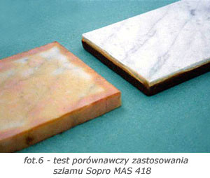 W tradycyjnej metodzie grubowarstwowej wskazane jest stosowanie spoiwa cementowego z dużą zawartością trasu. Dopełnieniem systemu jest zastosowanie zaprawy kontaktowej, odcinającej od wilgoci i zanieczyszczeń od spodu, uniemożliwiającej powstawanie wykwitów i radykalnie zwiększającej przyczepność. W przypadku okładzin mniej wrażliwych na przebarwienia będzie to Sopro HSF 748, a w przypadku szczególnie wrażliwych, cienkich i jasnych okładzin - szlam Sopro MAS 418 (fot. 6).