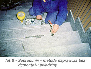 Pojawiające się podczas eksploatacji puste przestrzenie pod okładzinami prowadzą do ich uszkodzenia i w konsekwencji do remontu. Problem "głuchych" okładzin może zostać rozwiązany bez konieczności ich demontażu za pomocą specjalnej zaprawy iniekcyjnej Soprodur®, którą wtłacza się pod ciśnieniem w miejsca o osłabionym wiązaniu. Dzięki tej metodzie utrzymujemy dotychczasowy wygląd okładziny bez pyłu, kurzu i długotrwałego wyłączania obiektu z eksploatacji (fot. 8).